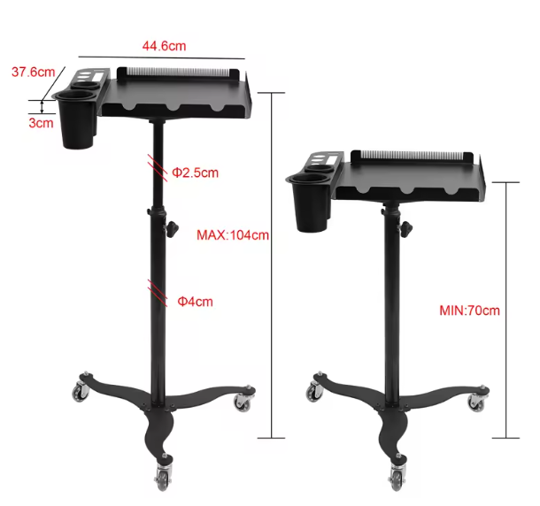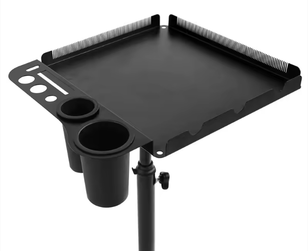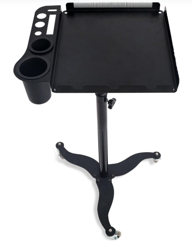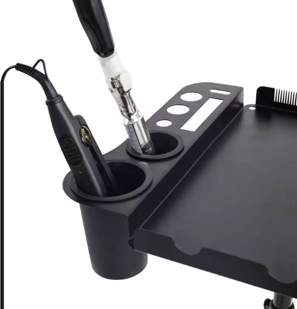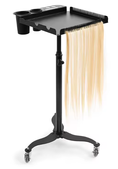 Meet your new studio essential, a sleek, mobile trolley designed for stylists who want beauty in their workflow and precision in their tools. The spacious tray keeps your brushes, clips, and everyday essentials within reach, while the integrated hanging panel holds your extension bundles neatly and securely during installs. A place for everything. Zero clutter. Maximum flow.